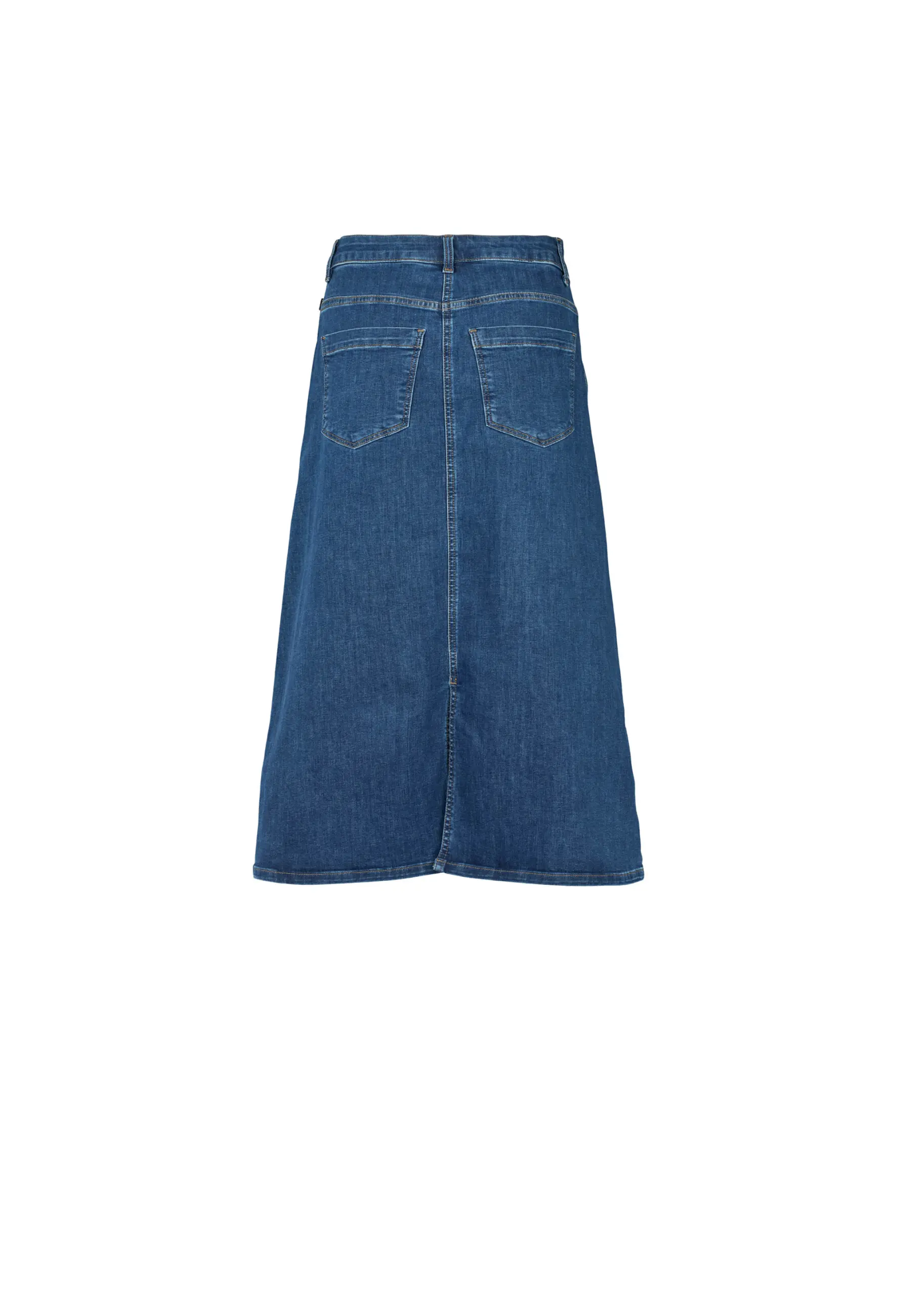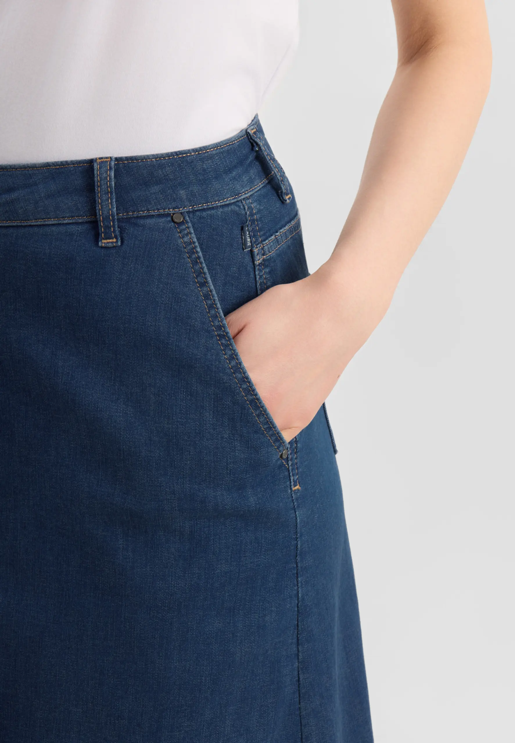 Denna snygga jeanskjol i längre modell kommer från Laurie. Kjolen har fast linning med knapp och dragkedja, sneda sidofickor och klassiska bakfickor samt bälteshällor. Fina sömmar fram och sprund bak för ökad rörlighet och bekvämlighet.