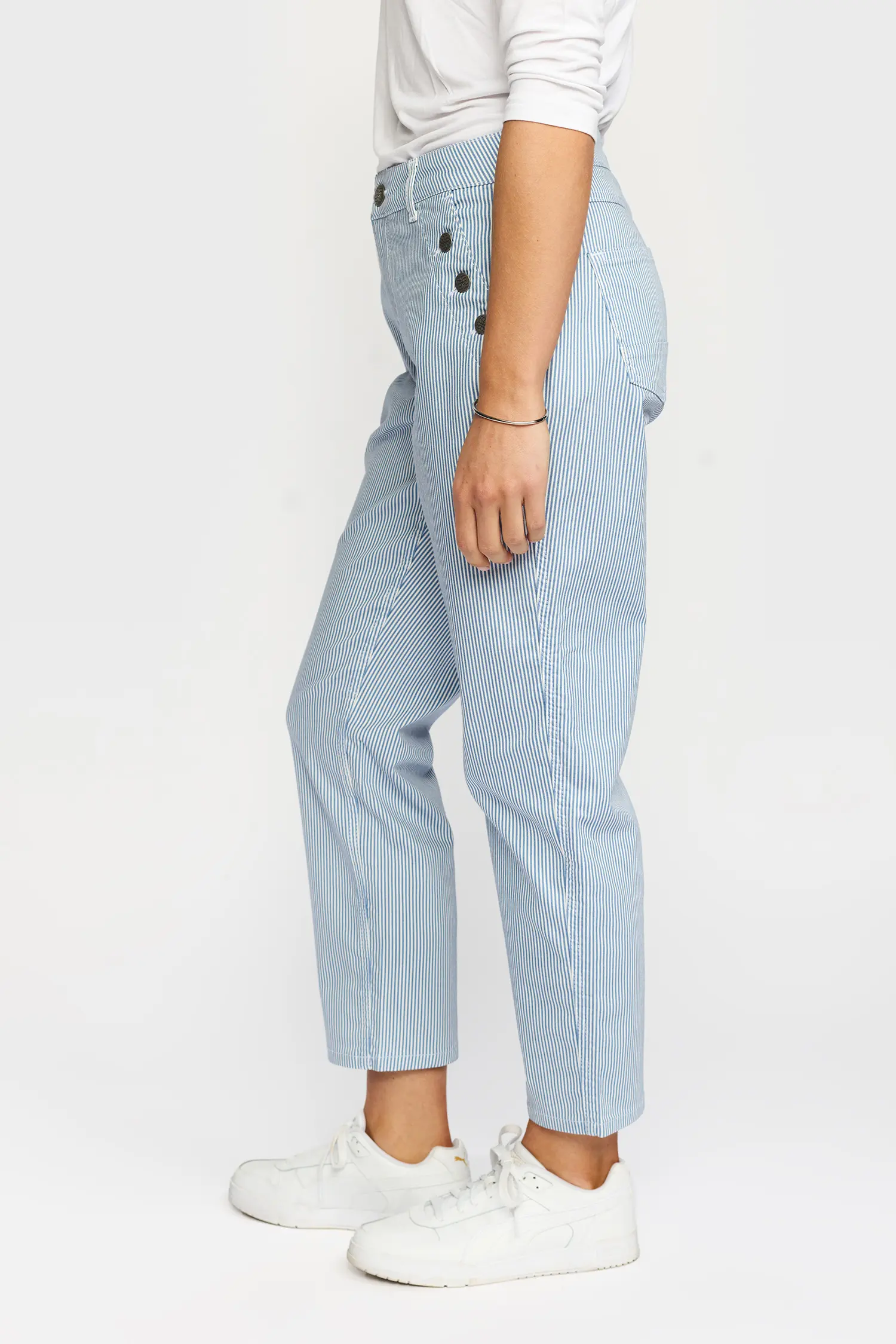 Hög midja, knapp och dragkedja samt snygga detaljer som knappar vid fickorna fram. Bakfickor samt bälteshällor.