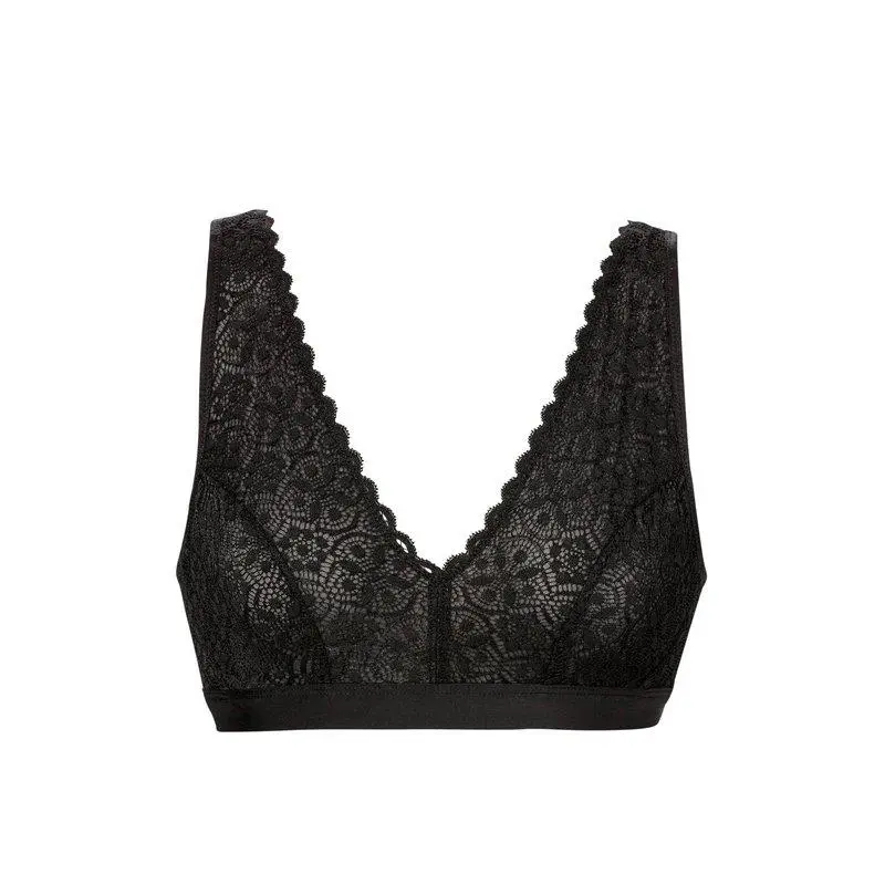 Fin BH utan bygel i helspets. Meshfoder i kupan och bred resår under bysten för bästa passform. Bred knäppning bak med tre hyskor.