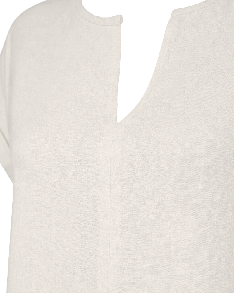 Blusen har rund halsringning med v-slits samt kort ärm med uppvik. Sprund på sidorna.