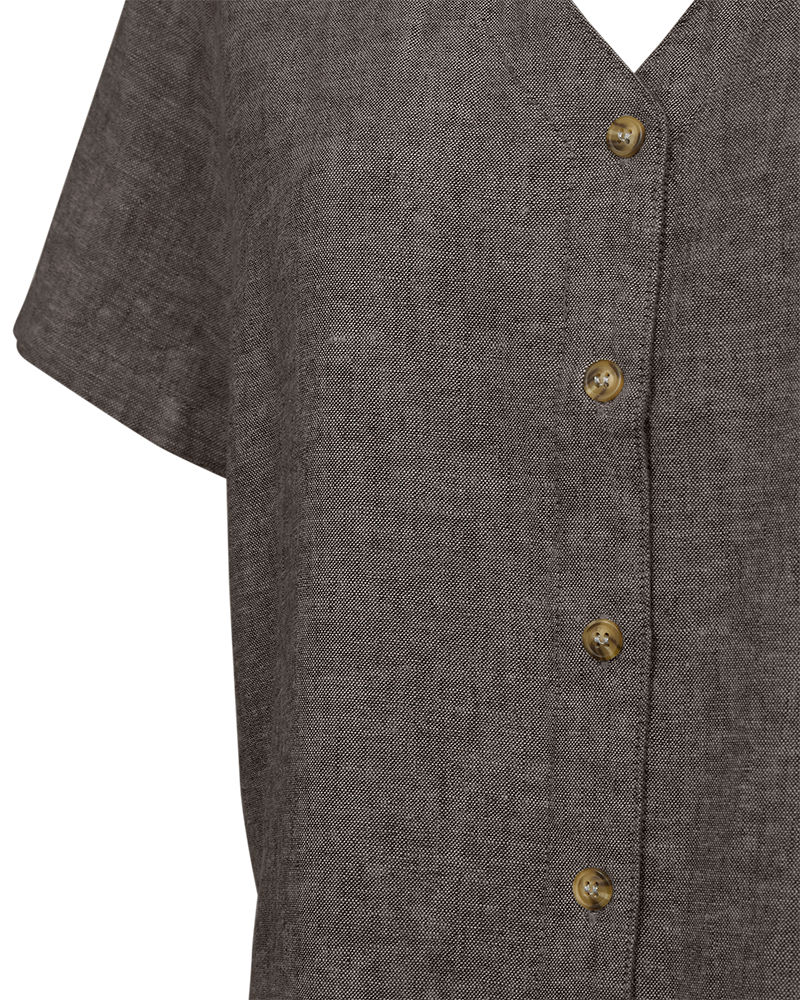 Härlig blus i linne/viskos kvalitet från FREE/QUENT. Blusen har genomgående knäppning och kort ärm. V-ringad.
