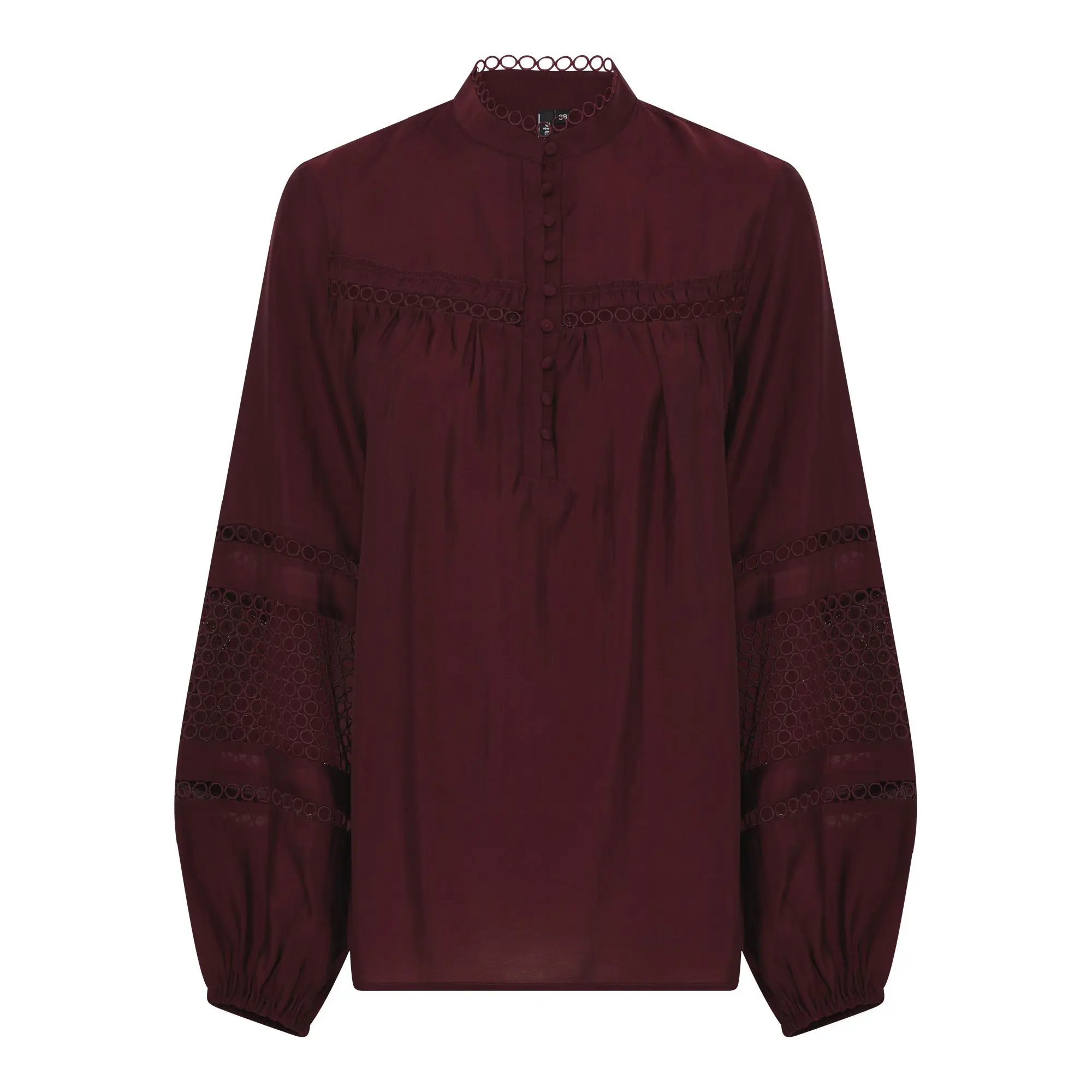 Denna fina blus med lång ärm i färgen Burgundy kommer från Soulmate. Fina detaljer i form av mönster och knappar upptill och mönster och resårkant vid ärmslut nedtill. Stylas fint ihop med kjol eller byxa.
