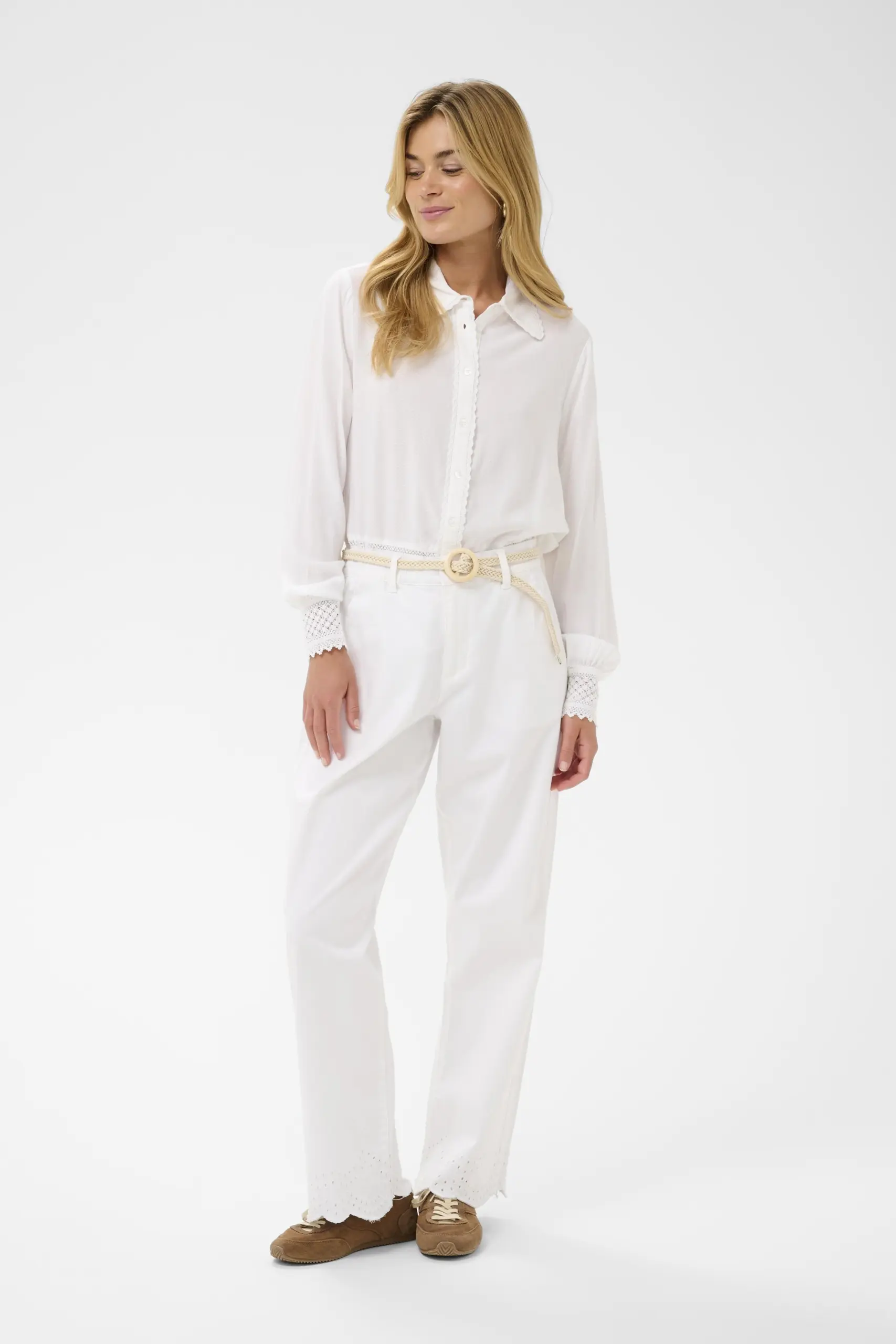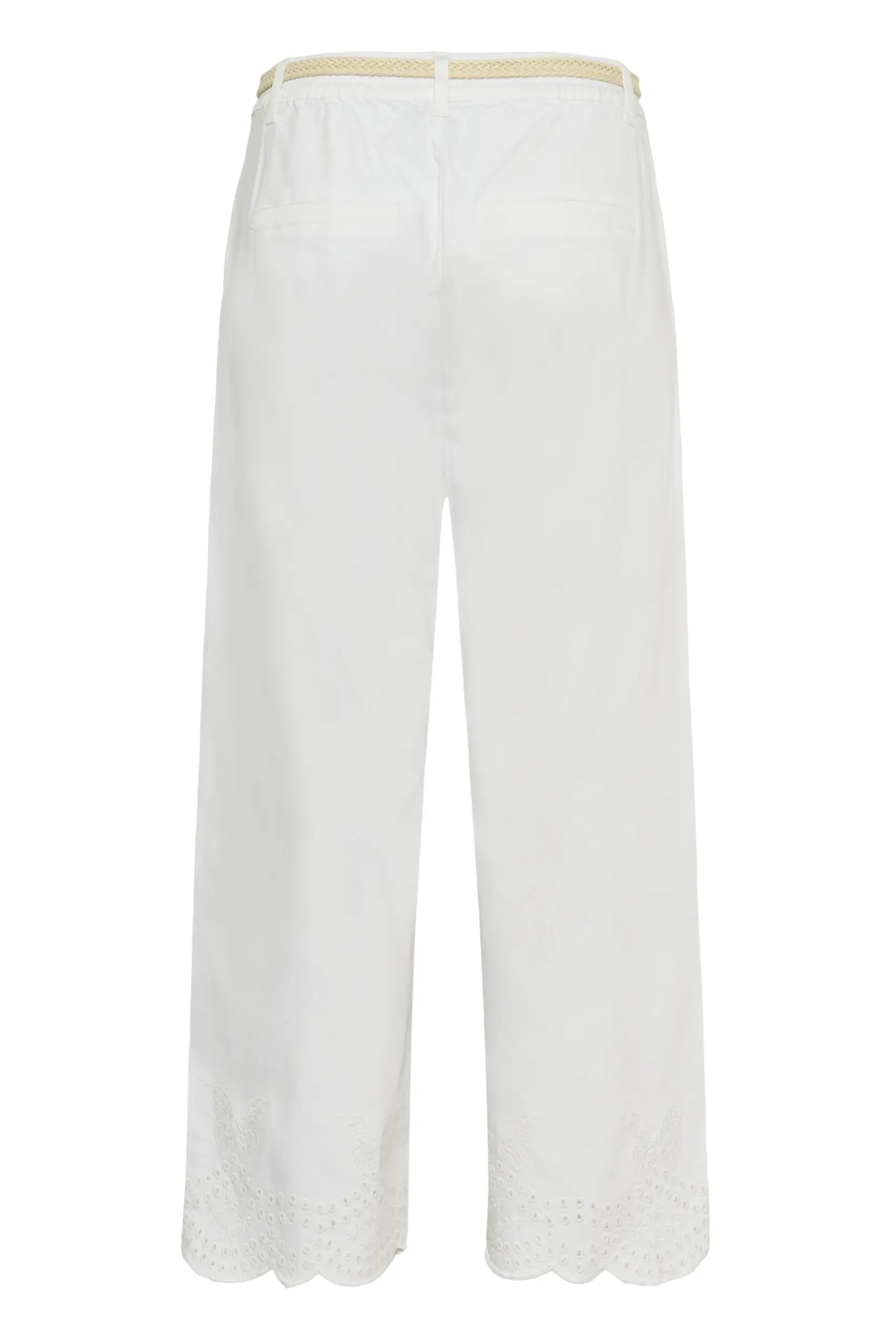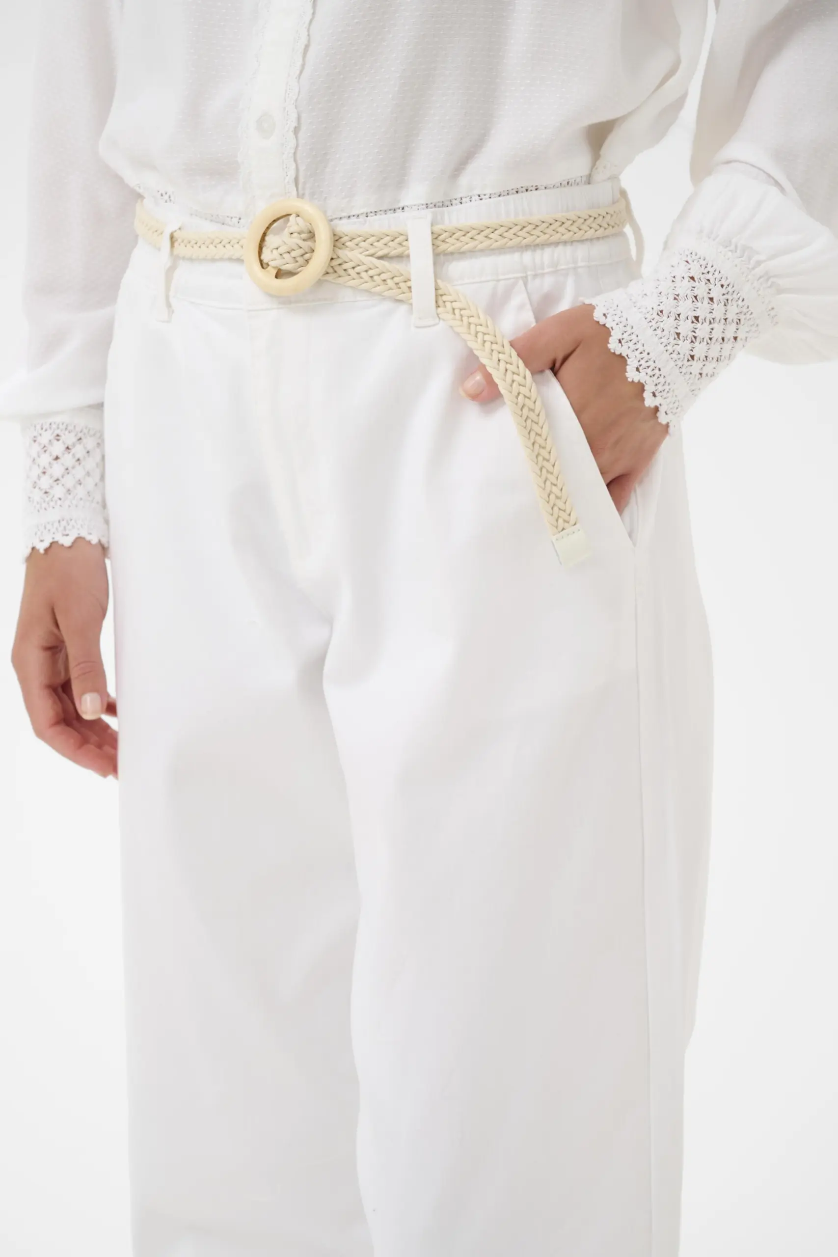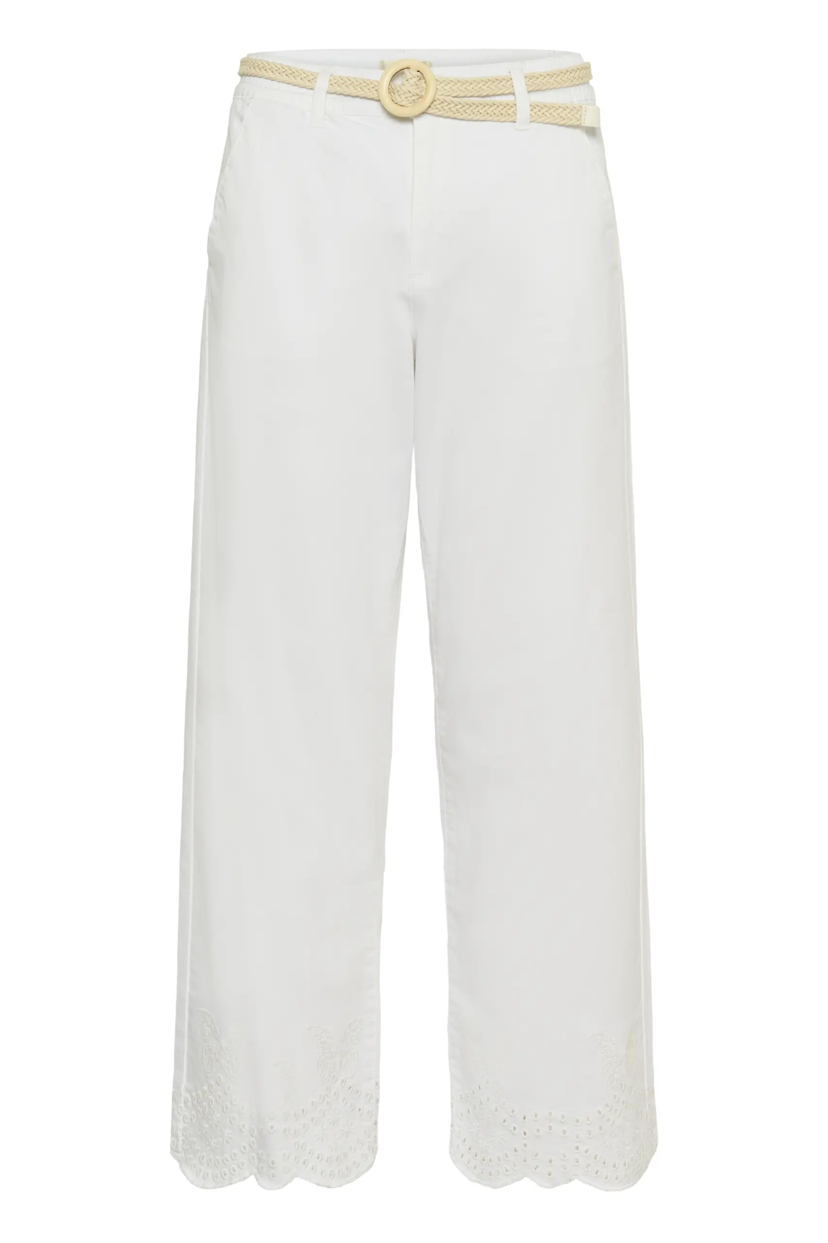 Fin vid rak byxa med diskret broderad vågkant nedtill från Cream. Elastisk midja med knapp och dragkedja samt bälteshällor. Flätat bälte medföljer som går att ta av. Härlig byxa med mjuk yta som passar lika fint i vardagen som till säsongen festligheter.