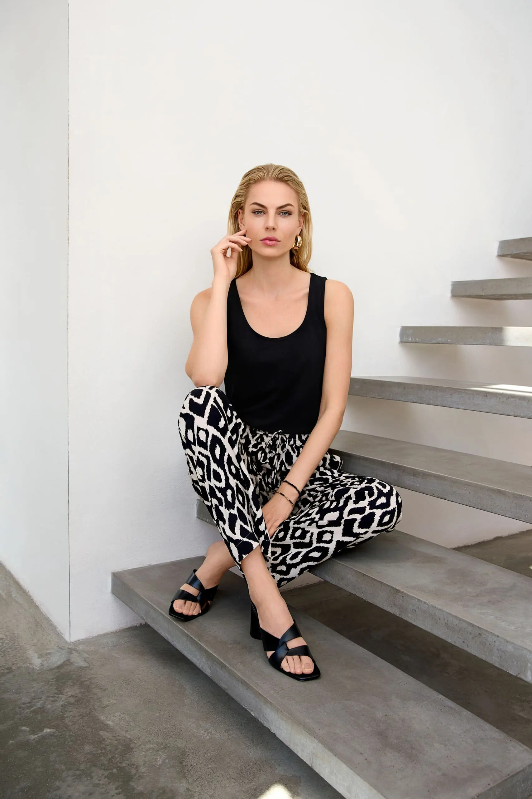 Byxan har resår i midjan med snörning som man även kan dra åt samt sneda byxfickor. medelhög midja.