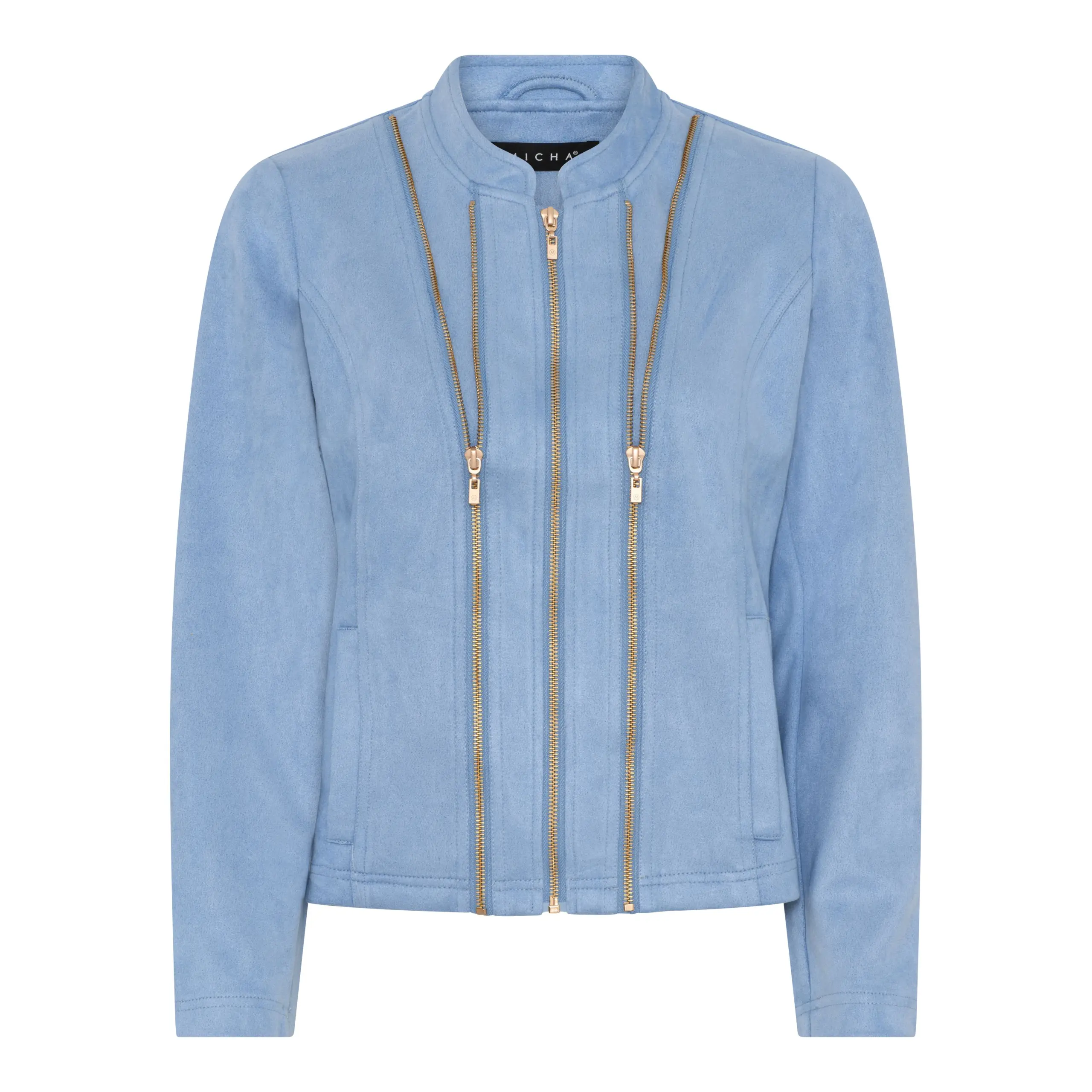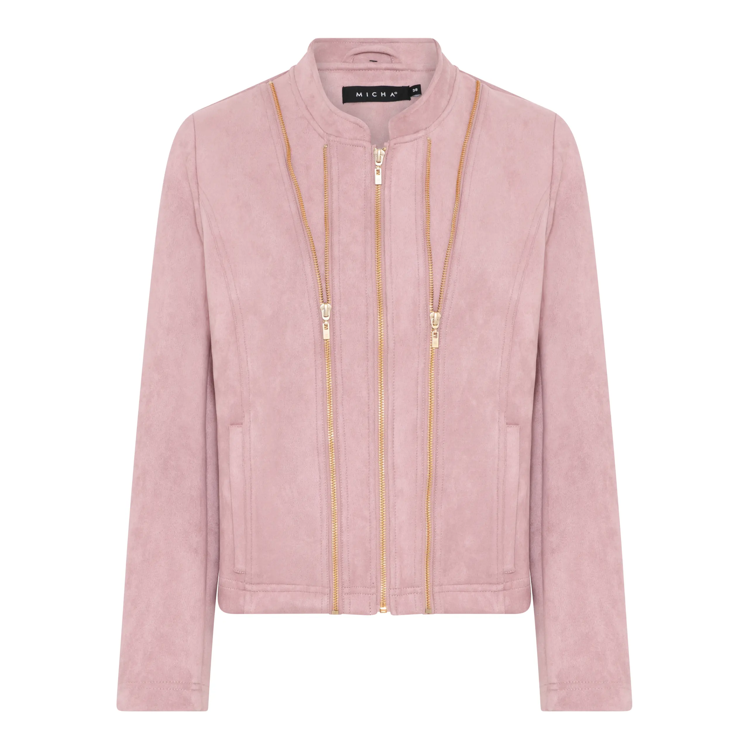 Urläcker jacka i fuskmocka från Micha. Dragkedja i guldfärg och två fickor fram. Två dekorativa dragkedjor i guldfärg. Perfekt för både inomhus och utomhus bruk.