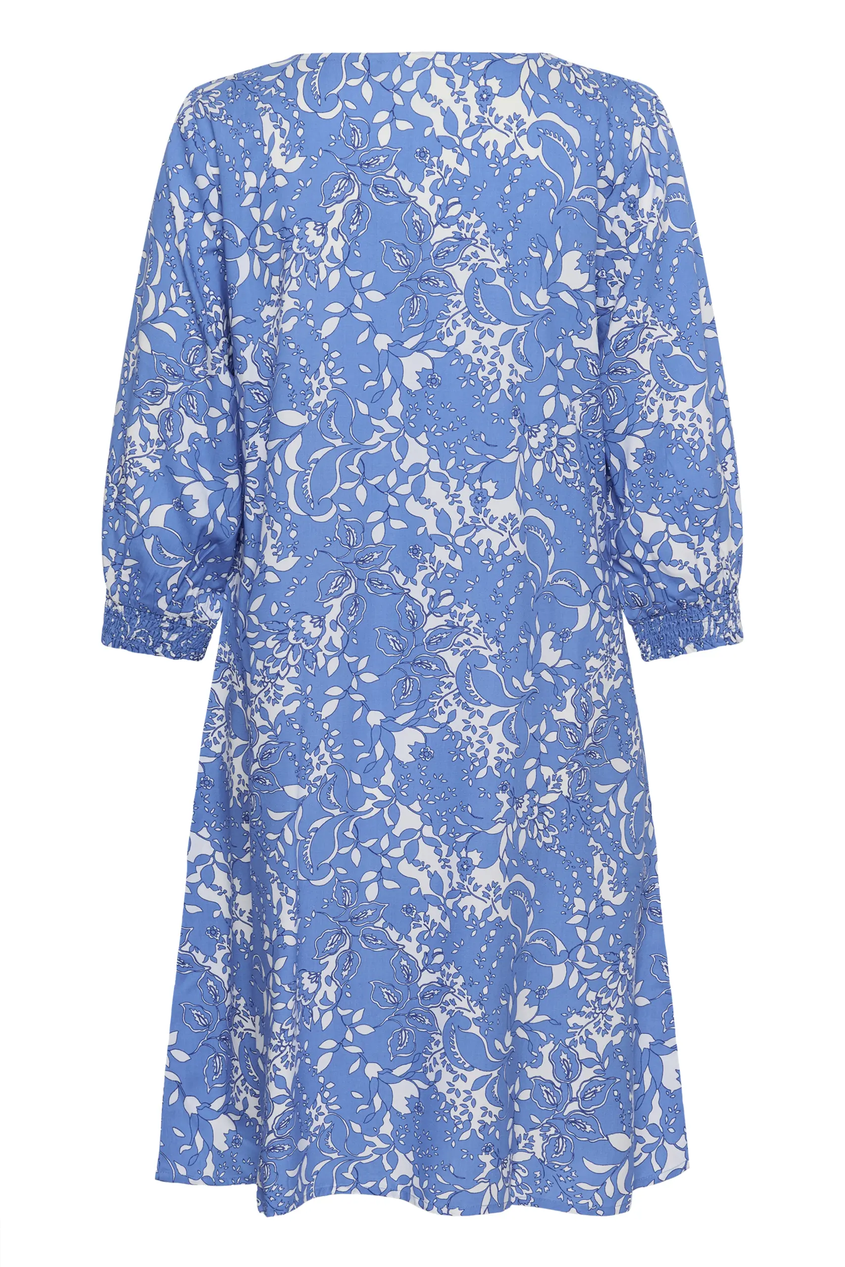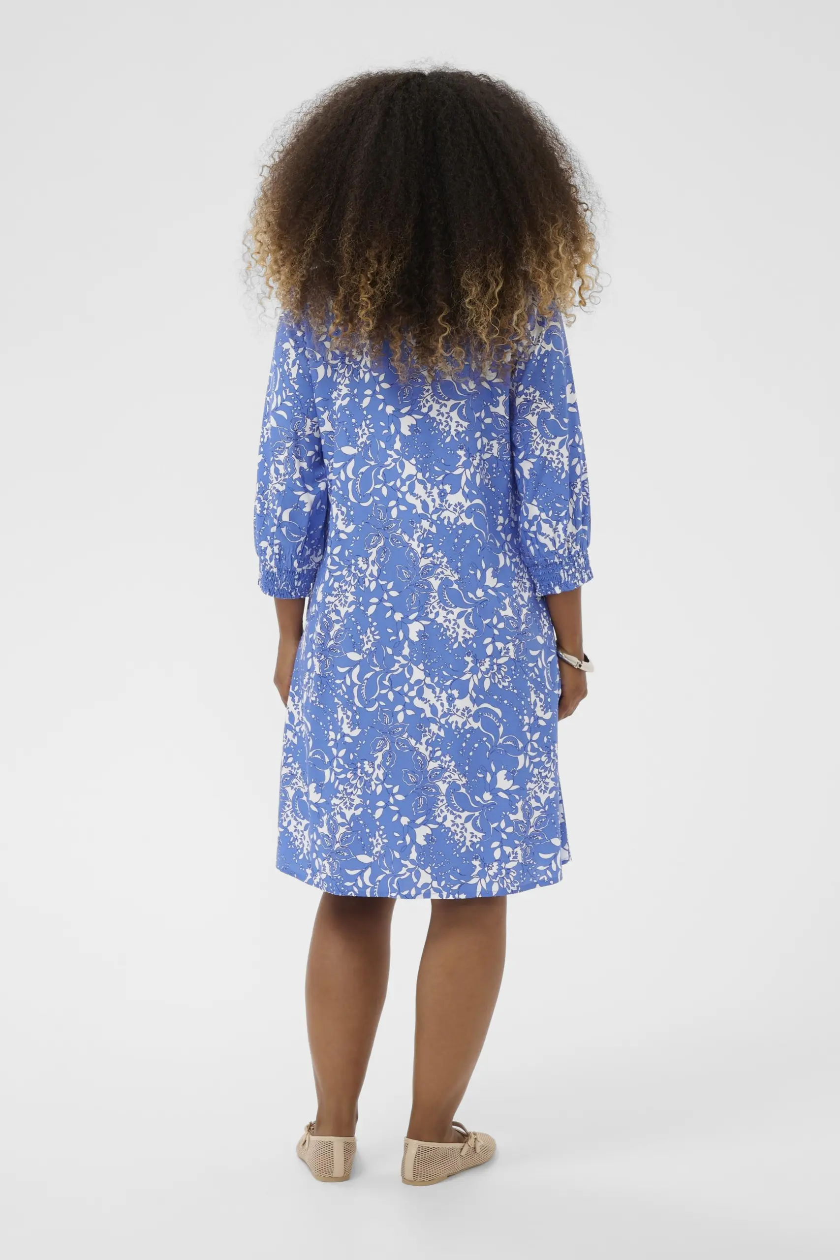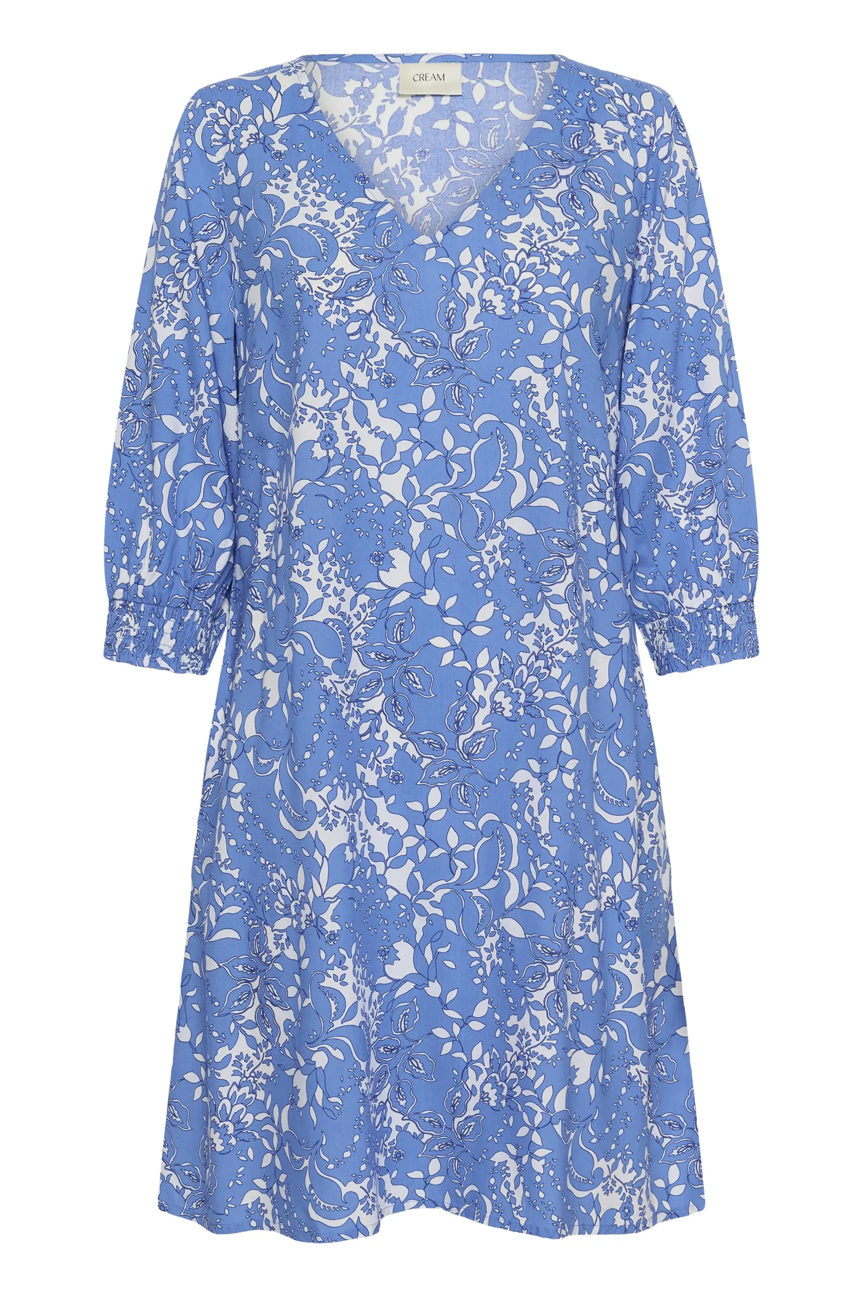 Härlig vår och sommar klänning i 100% viskos från Cream. knälång modell med 3/4 ärm, smockad resår vid ärmslut. Fickor på sidorna.