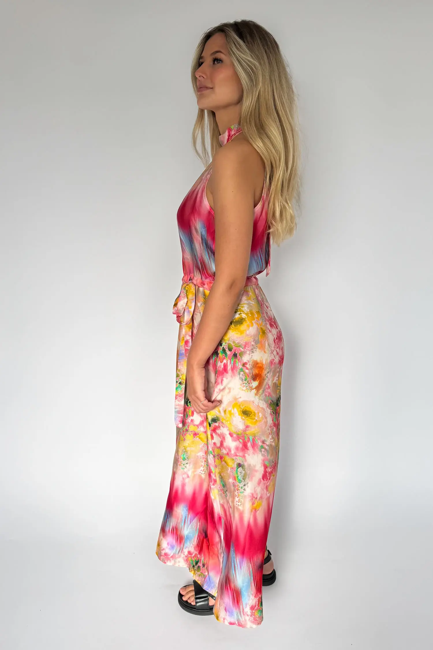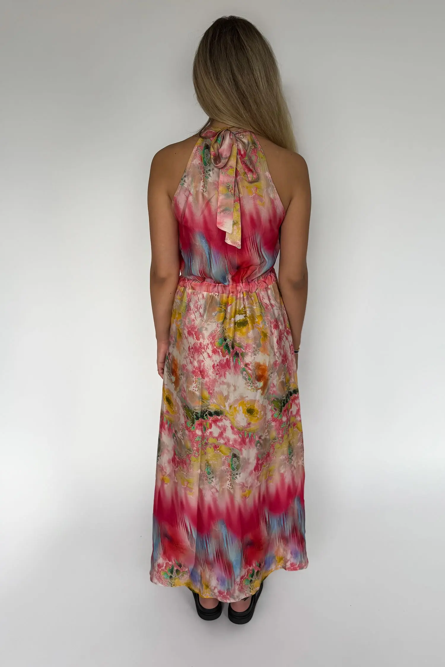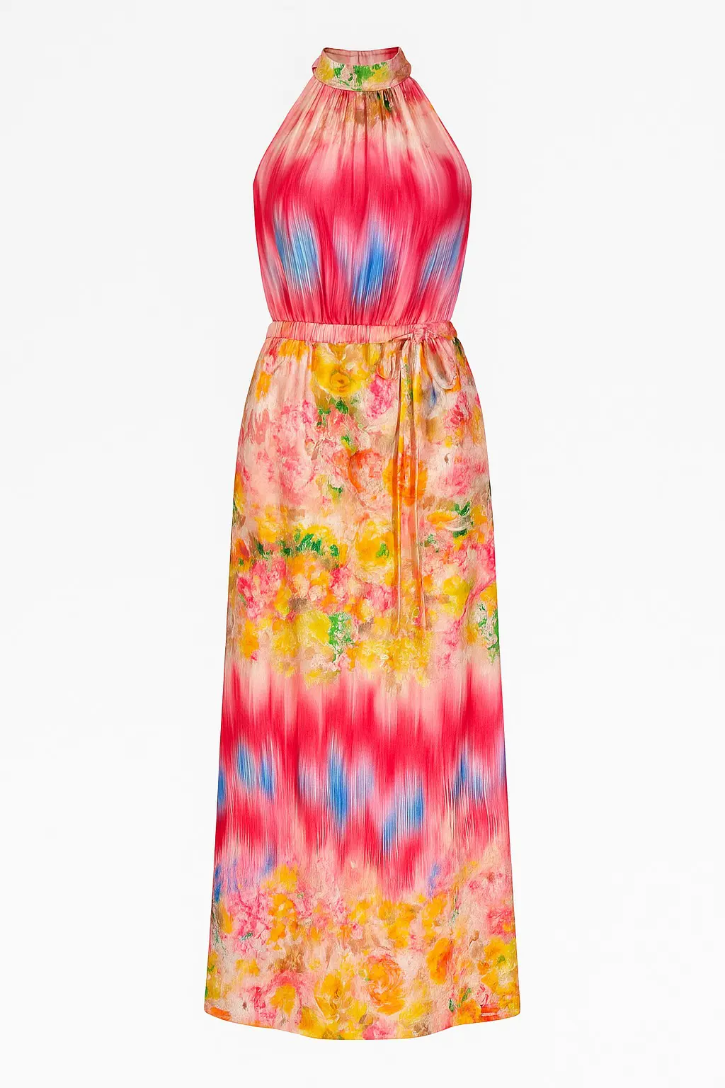 Mönstrad klänning i halterneck modell. Midi längd och med dekorativt knytband i midjan. Härligt mönster i sommarens alla färger.