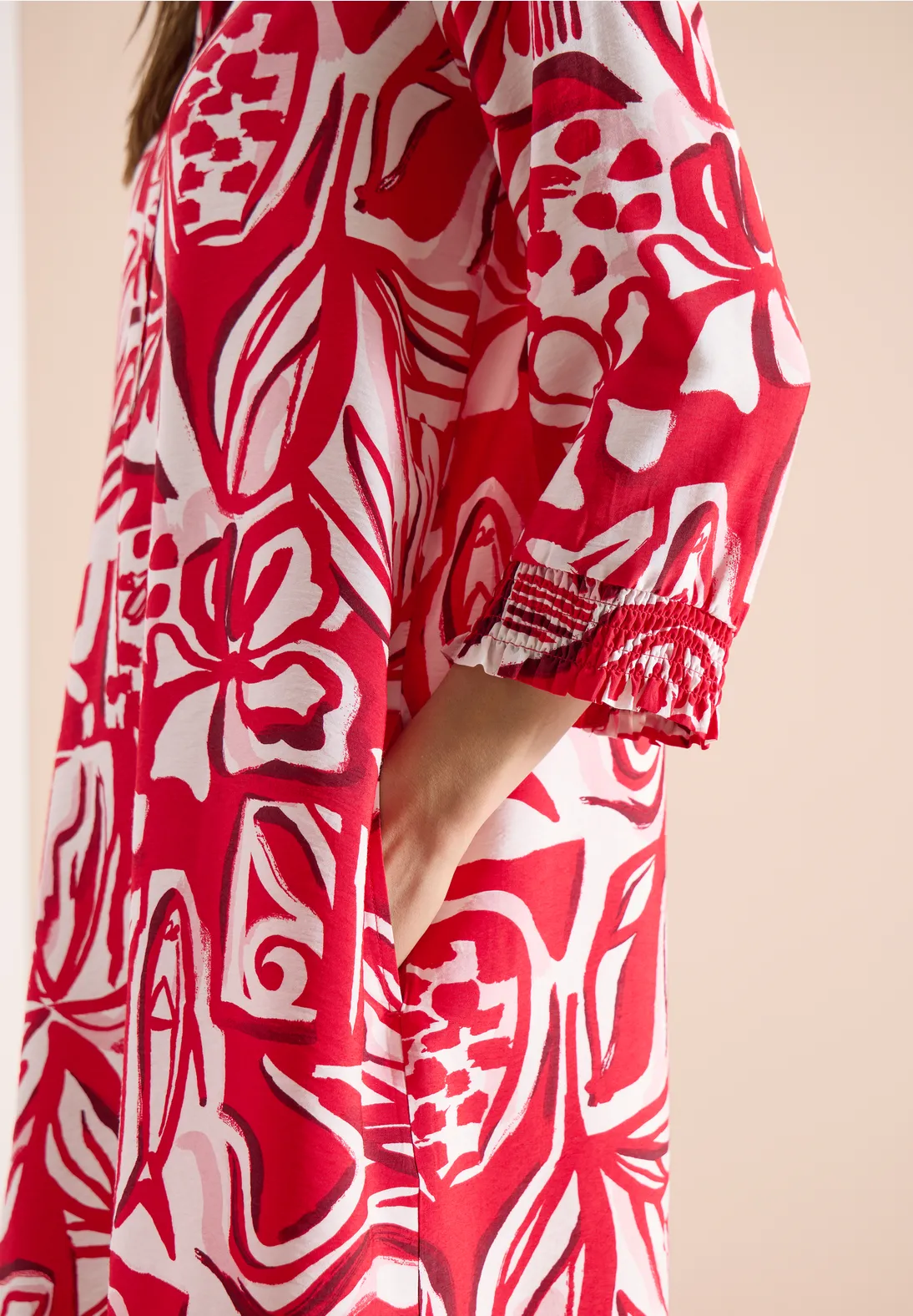 Jättehärlig mönstrad knälång klänning med viskosblandning från Cecil. Klänningen har rund halsringning med v-slits och knappslå fram samt 3/4-ärm med smockat ärmslut.