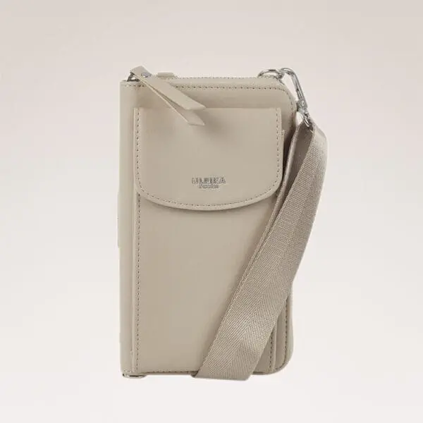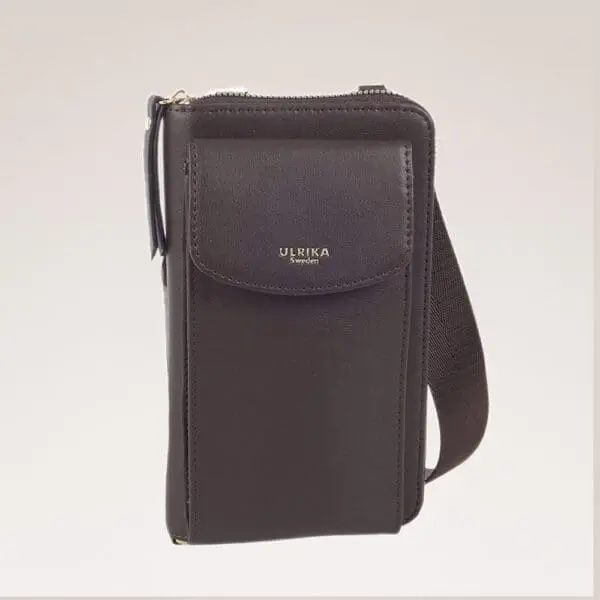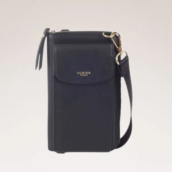 Väskan har ett stort fack för mobil och en del som fungerar som plånbok med fack för kontanter, kort och sedlar.