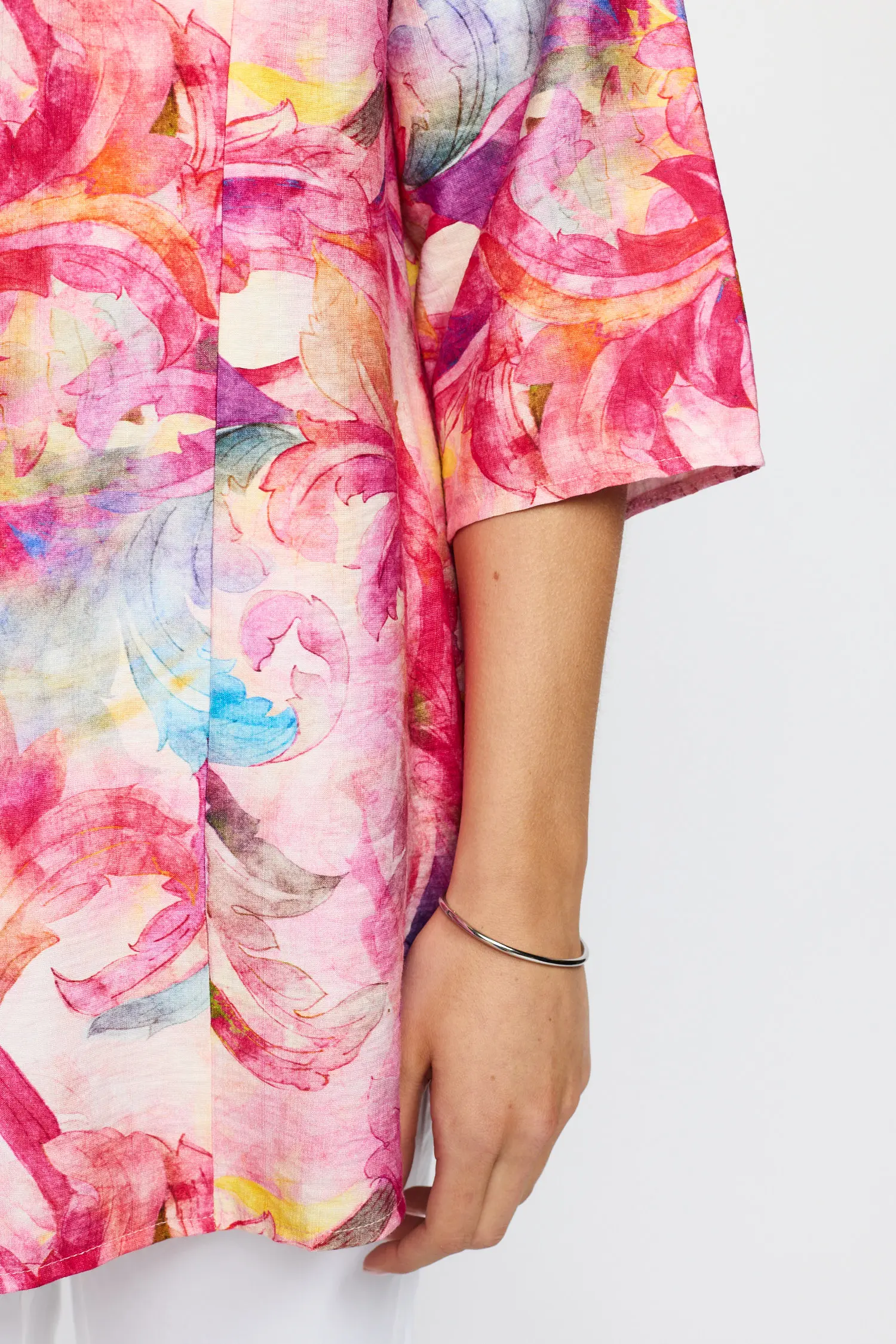 Jättefin rosamönstrad skjortblus i längre modell från 2-Biz. Rundhalsringning med genomgående knäppning fram samt 3/4-ärm.