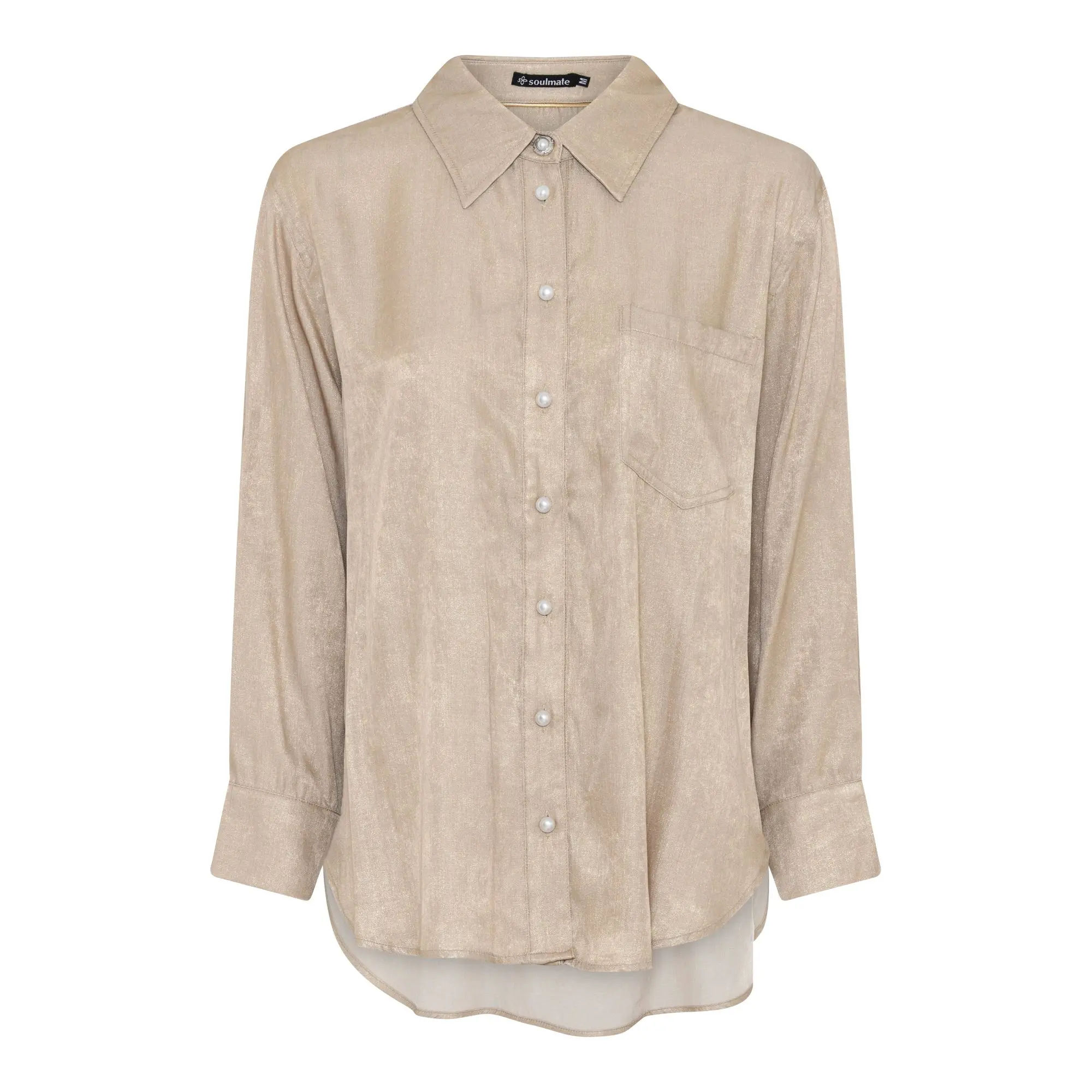 Fin beige skjorta med guldskimmer från Soulmate. Skjortan har krage och knäppning fram med fina pärlknappar samt en bröstficka.