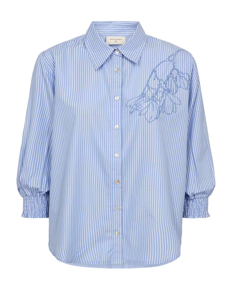 Snygg användbar blå/vit randig skjorta från FREE/QUENT. Skjortan har genomgående knäppning och krage samt 3/4-ärm med smockresår som avslut.