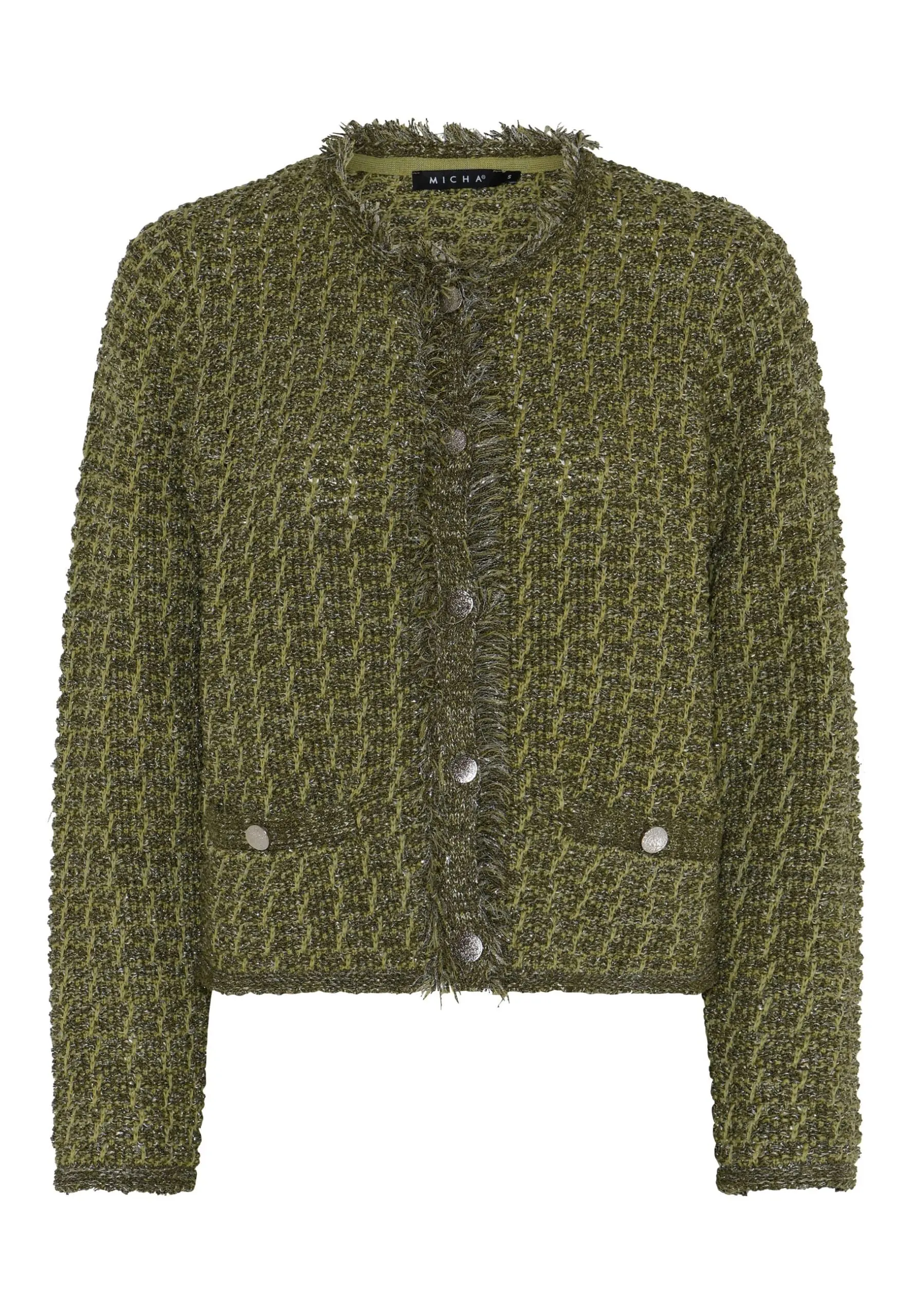 Denna vackra cardigan med struktur och metalltrådar i tyget kommer från Micha. En fin franskant som pryder både den runda halsringningen samt längst med silverknapparna. Fickor fram.