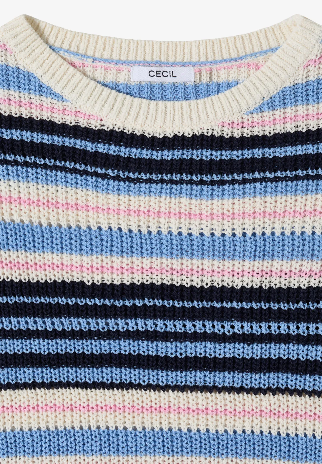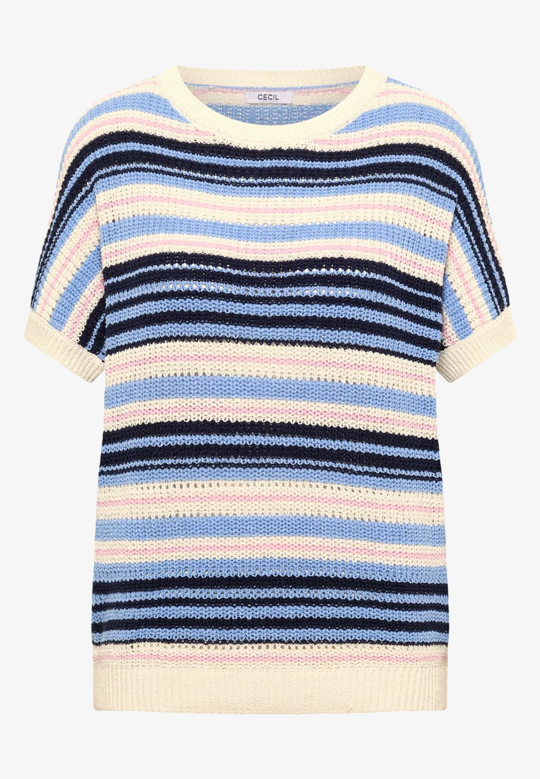 Härlig flerfärgad stickad jumper i bandgarnskvalitet från Cecil. Lätt båthalsringning och kort ärm.