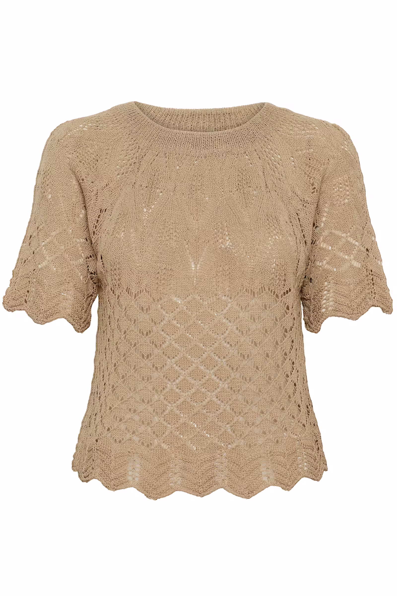 Hålstickad topp i fint mönster med kort ärm från Cream. Rak modell och rund hals. Jättesnygg ljusare brun färg.