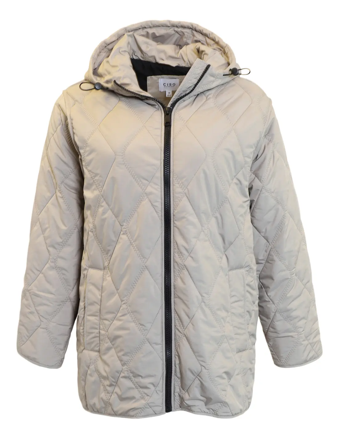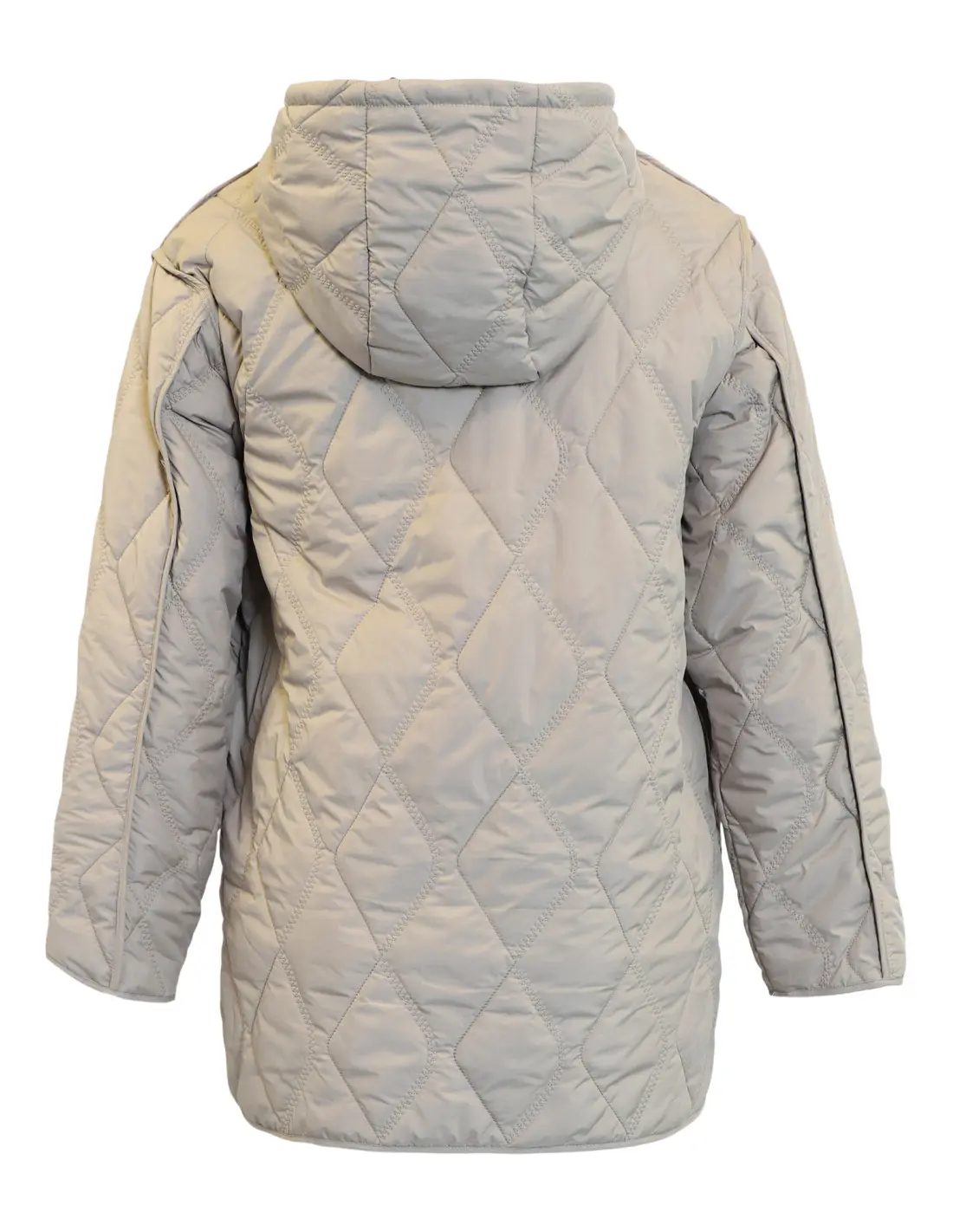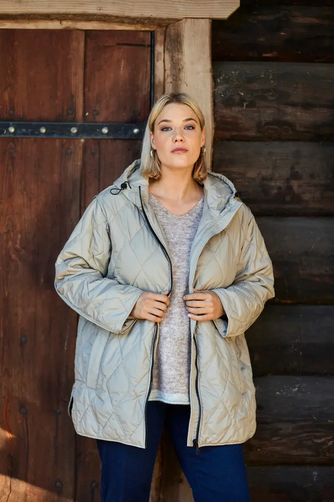 Vadderad jacka i mellantjocklek. Perfekt för höstens kallare mornar och kvällar. Fin längd som hamnar precis nedanför rumpan. Sprund i sidorna för ökad rörlighet tex vid bilåkning. Fast huva med dragsko.
