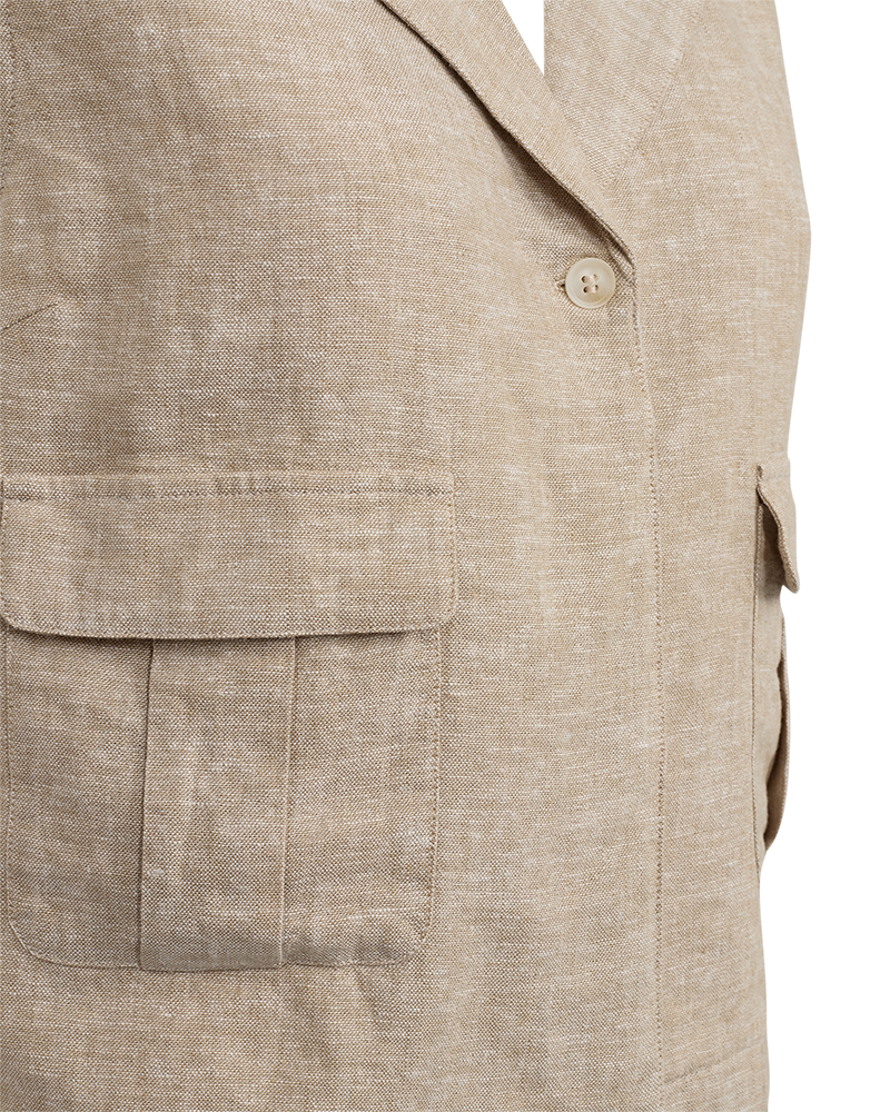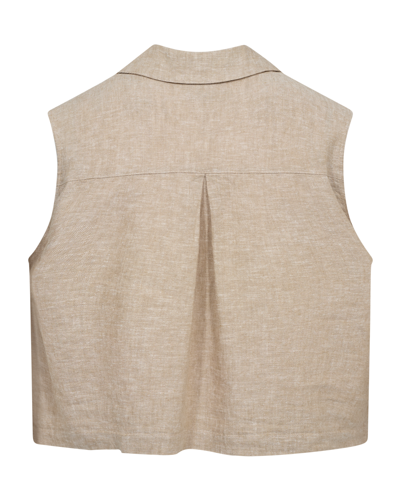 Tuff väst i lin/viskos blandning från Freequent. Rakare något kortare modell i modernt snitt. 1 knapp och större fickor. Bär den som den är eller sätt en tunn tröja eller T-shirt under.